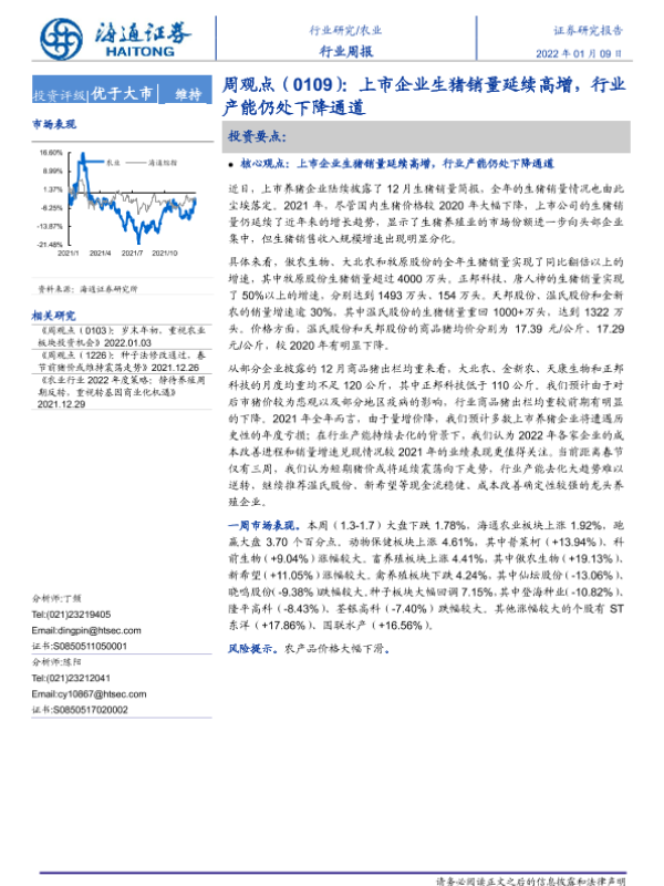 【海通证券】【20220109】20220109-海通证券-农业周观点:上市企业生猪销量延续高增,行业产能仍处下降通道-4页 行业研究