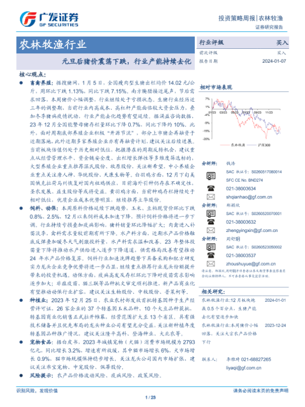 【广发证券】【20240107】20240107-广发证券-农林牧渔行业投资策略周报:元旦后猪价震荡下跌,行业产能持续去化-23页 行业研究