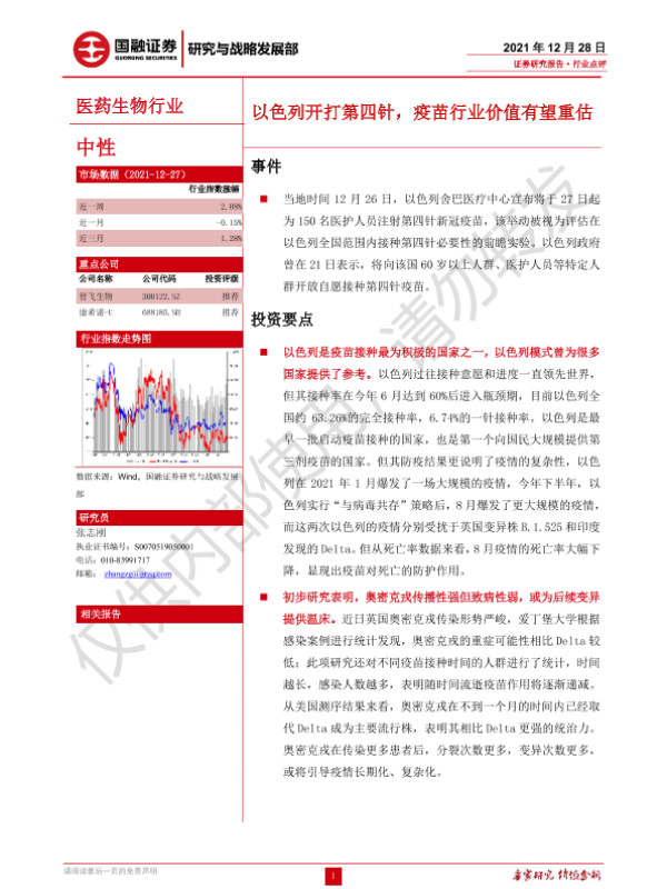 【国融证券】【20211228】医药生物行业:以色列开打第四针,疫苗行业价值有望重估-3页 行业研究