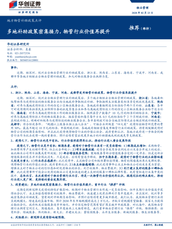【华创证券】【20200223】地方物管补助政策点评:多地补助政策密集接力,物管行业价值再提升-7页 行业研究