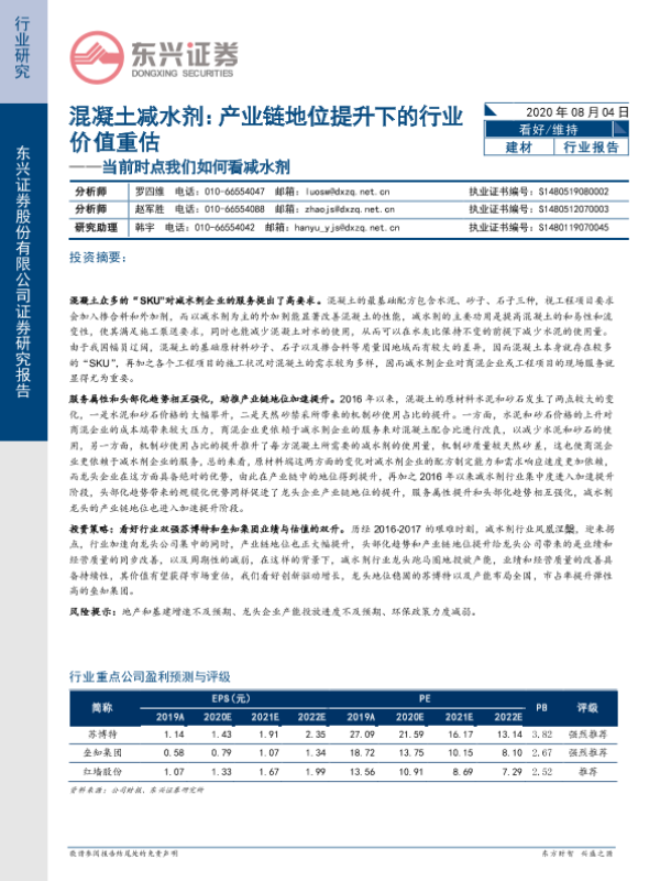 【东兴证券】【20200804】当前时点我们如何看减水剂:混凝土减水剂:产业链地位提升下的行业价值重估-14页 行业研究