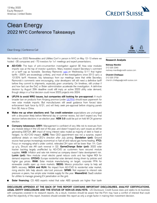 【瑞信】【20220513】瑞信-美股清洁能源行业-2022年纽约大会要点-23页 会议纪要