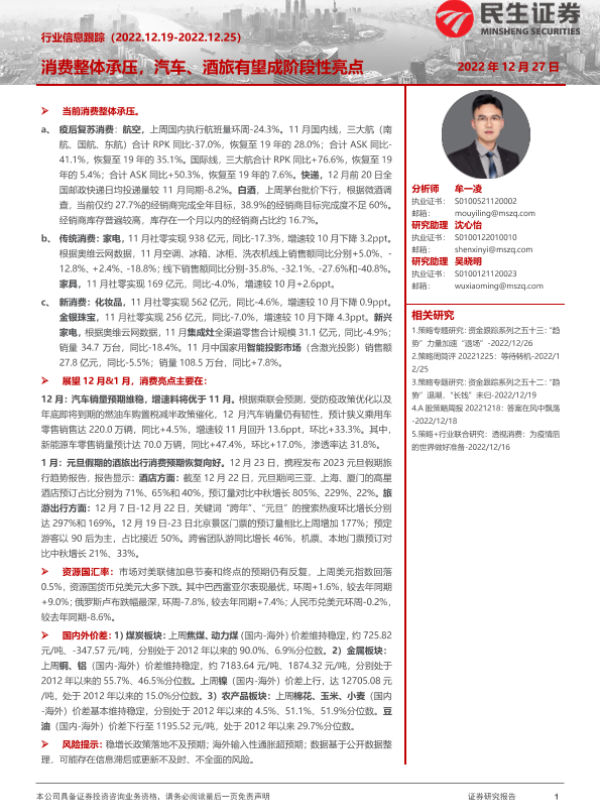 【民生证券】【20221227】策略专题研究:行业信息跟踪,消费整体承压,汽车、酒旅有望成阶段性亮点-29页 行业研究