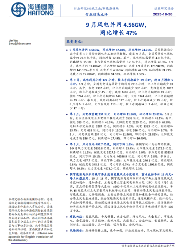 【海通国际】【20231030】20231030-海通国际-新能源板块行业信息点评:9月风电并网4.56GW,同比增长47%-10页 行业研究