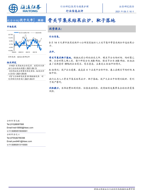 【海通证券】【20210916】骨关节集采结果出炉,靴子落地-2页 行业研究