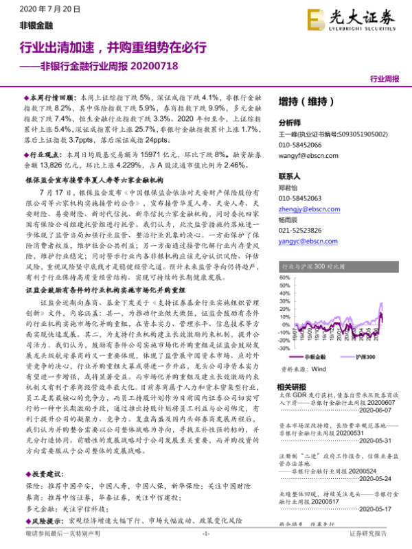 【光大证券】【20200720】非银行金融行业周报:行业出清加速,并购重组势在必行-16页 行业研究