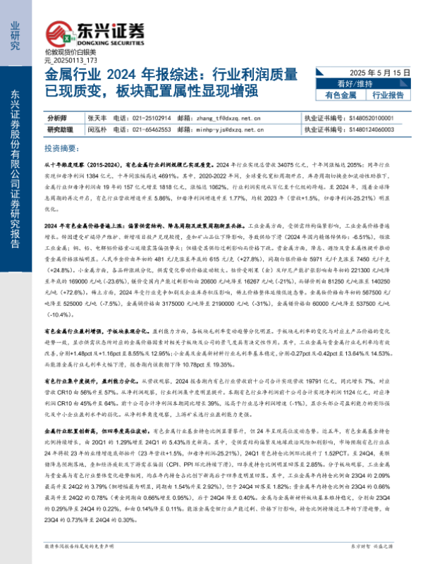 【东兴证券】【20250515】金属行业2024年报综述:行业利润质量已现质变,板块配置属性显现增强-14页 行业研究