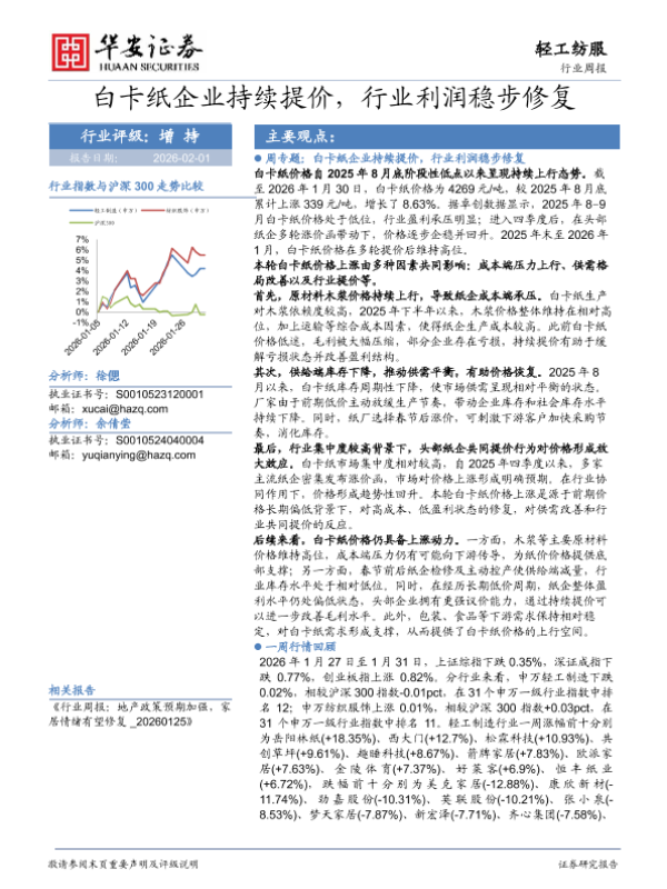 【华安证券】【202602】白卡纸企业持续提价,行业利润稳步修复-20页 行业研究
