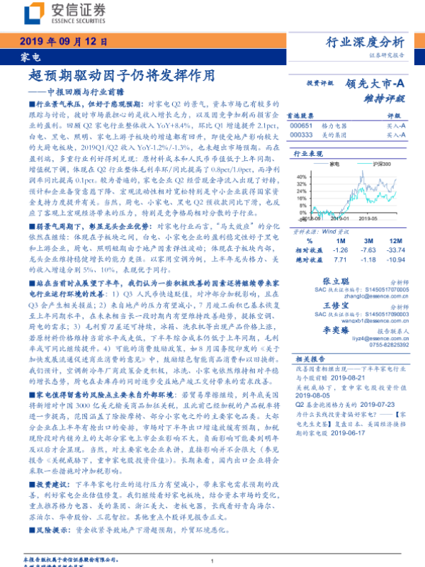 【安信证券】【20190912】家电行业中报回顾与行业前瞻:超预期驱动因子仍将发挥作用-24页 行业研究