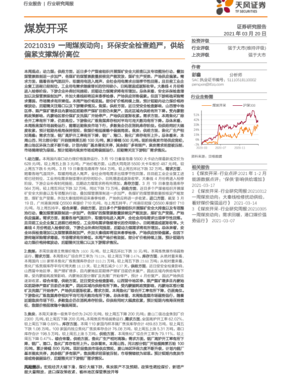 【天风证券】【20210320】20210319-天风证券-煤炭开采一周煤炭动向:环保安全检查趋严,供给偏紧支撑煤价高位-19页 行业研究