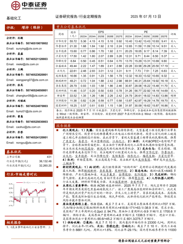 【中泰证券】【20250713】基础化工行业:陶氏关闭英国有机硅厂,AI材料产业持续升级-28页 证券期货研究报告