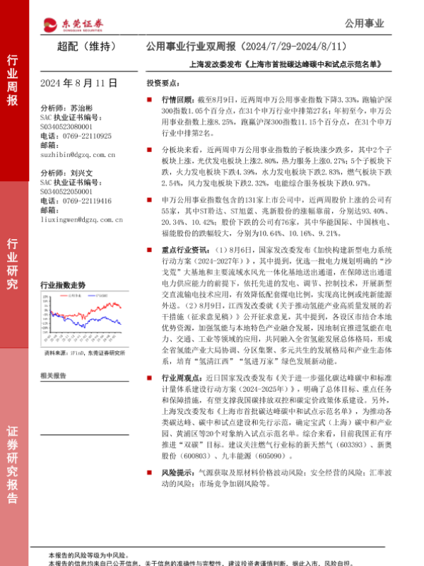 【东莞证券】【20240811】公用事业行业双周报:上海发改委发布《上海市首批碳达峰碳中和试点示范名单》-10页 行业研究