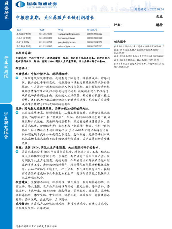 【国泰海通证券】【202508】农业:中报密集期,关注养殖产业链利润增长-10页 证券期货研究报告