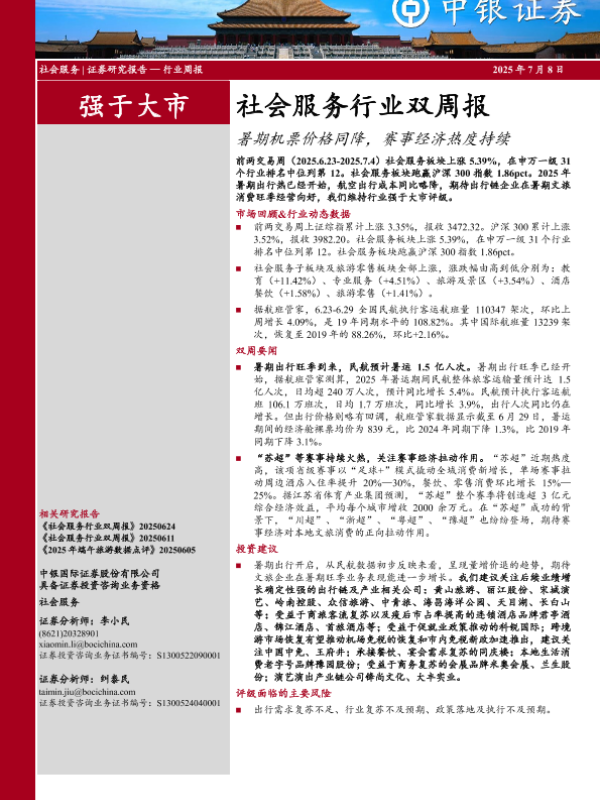【中银证券】【20250708】社会服务行业双周报:暑期机票价格同降,赛事经济热度持续-15页 证券期货研究报告