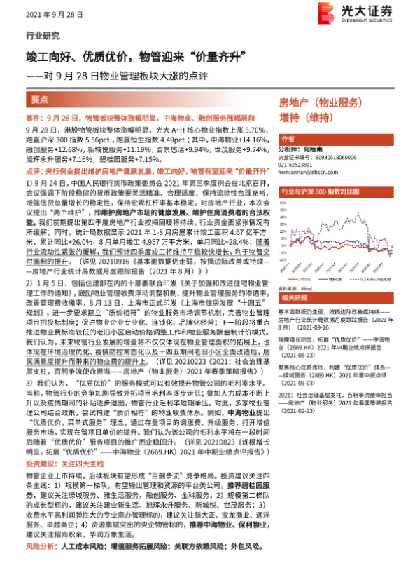 【光大证券】【20210928】对9月28日物业管理板块大涨的点评:竣工向好、优质优价,物管迎来“价量齐升”-3页 行业研究