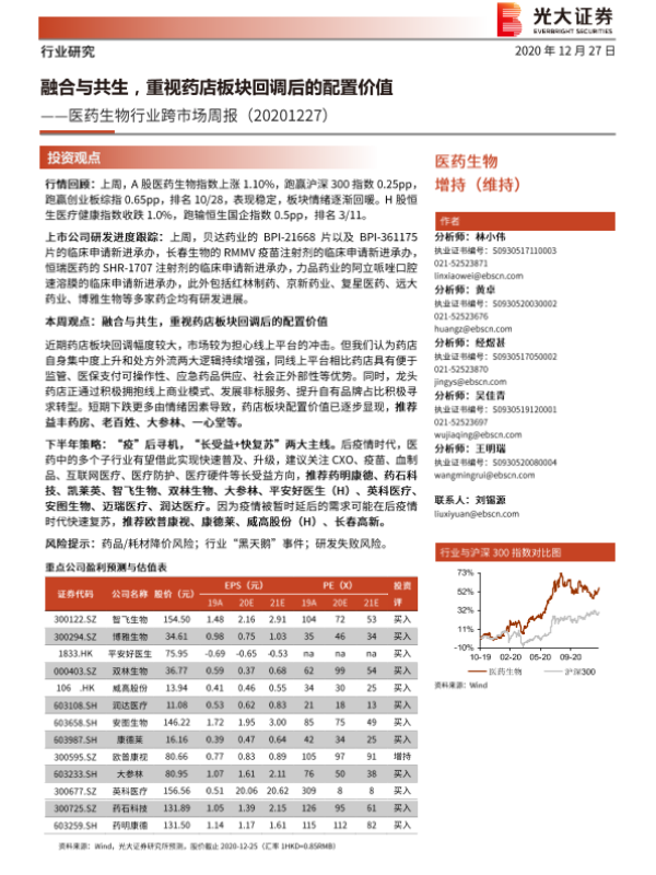【光大证券】【20201227】医药生物行业跨市场周报:融合与共生,重视药店板块回调后的配置价值-33页 行业研究