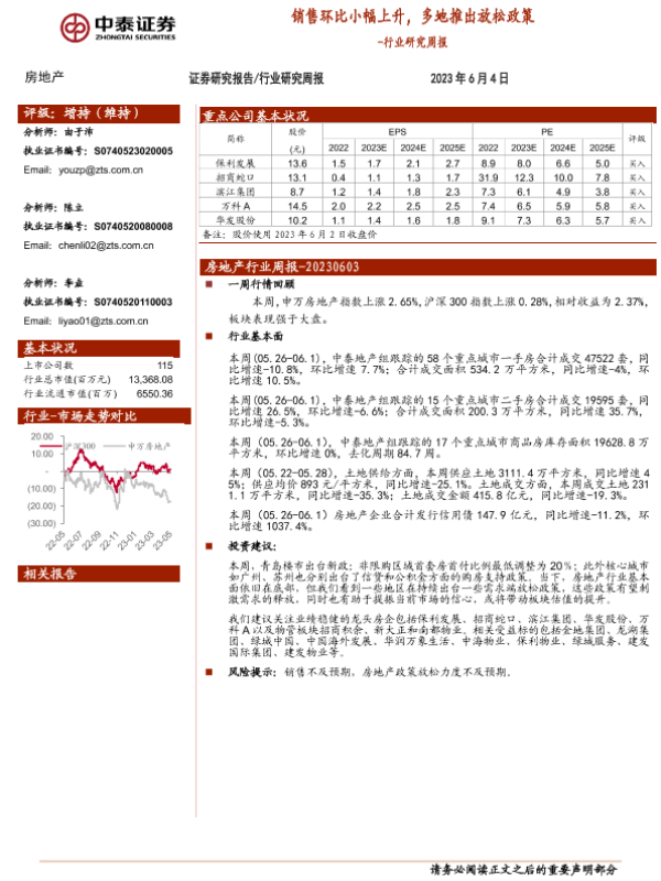 【中泰证券】【20230604】房地产行业研究周报:销售环比小幅上升,多地推出放松政策-15页 行业研究
