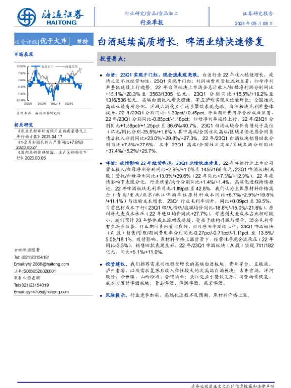 【海通证券】【20230508】20230508-海通证券-食品加工行业季报:白酒延续高质增长,啤酒业绩快速修复-24页 行业研究