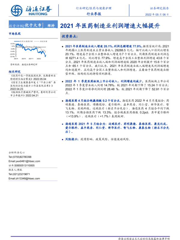 【海通证券】【20220506】2021年医药制造业利润增速大幅提升-8页 行业研究