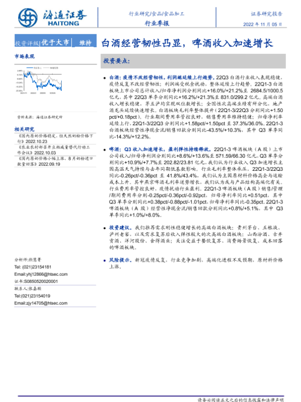 【海通证券】【20221105】20221105-海通证券-食品加工行业季报:白酒经营韧性凸显,啤酒收入加速增长-22页 行业研究