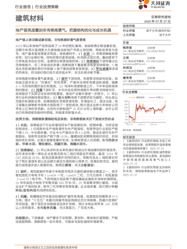 【天风证券】【202507】建筑材料行业投资策略:地产链筑底叠加非传统高景气,把握结构优化与成长机遇-52页 证券期货研究报告