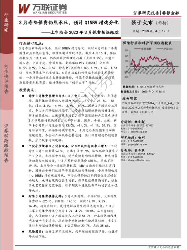 【万联证券】【20200417】上市险企2020年3月保费数据跟踪:3月寿险保费仍然承压,预计Q1NBV增速分化-3页 行业研究
