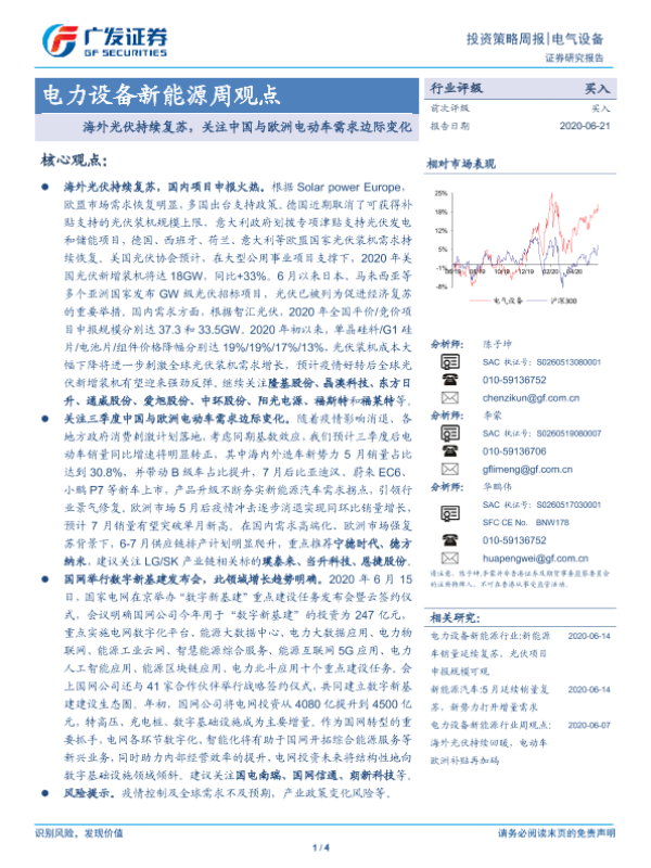 【广发证券】【20200621】电力设备新能源周观点:海外光伏持续复苏,关注中国与欧洲电动车需求边际变化-4页 行业研究