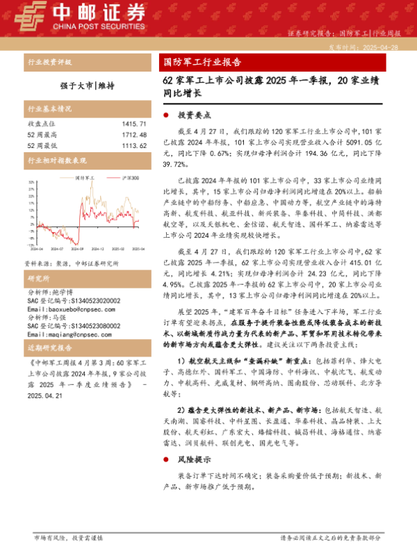 【中邮证券】【20250428】国防军工行业报告:62家军工上市公司披露2025年一季报,20家业绩同比增长-14页 证券期货研究报告