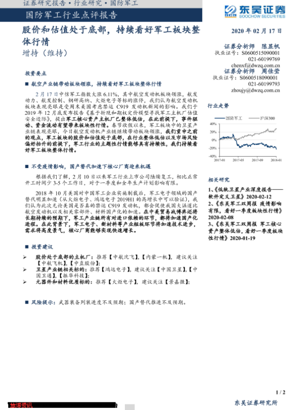 【东吴证券】【20200217】国防军工行业点评报告:股价和估值处于底部,持续看好军工板块整体行情-2页 行业研究