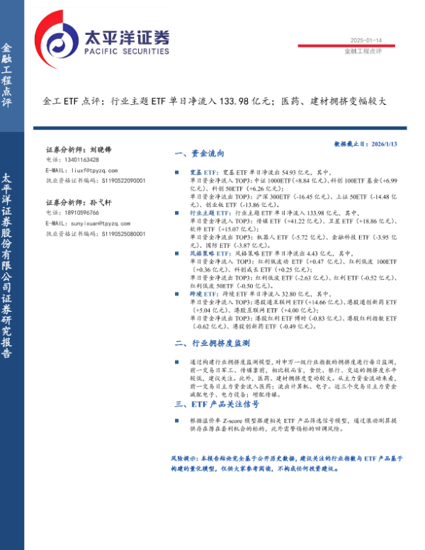 【太平洋证券】【202601】金工 ETF点评:行业主题 ETF单日净流入 133.98亿元;医药、建材拥挤变幅较大-6页 证券期货研究报告