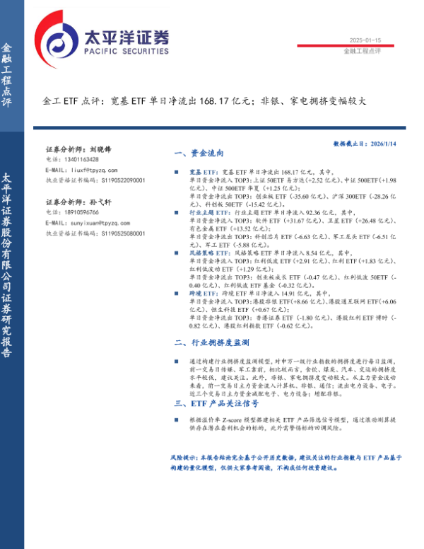 【太平洋证券】【202601】金工 ETF点评:宽基 ETF单日净流出 168.17亿元;非银、家电拥挤变幅较大-6页 证券期货研究报告