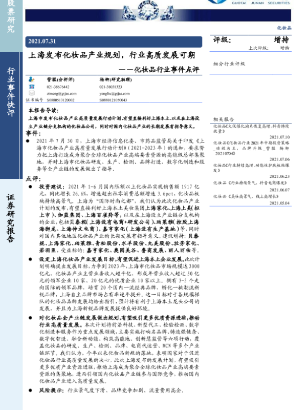 【国泰君安证券】【20210731】上海发布化妆品产业规划,行业高质发展可期-3页 行业研究
