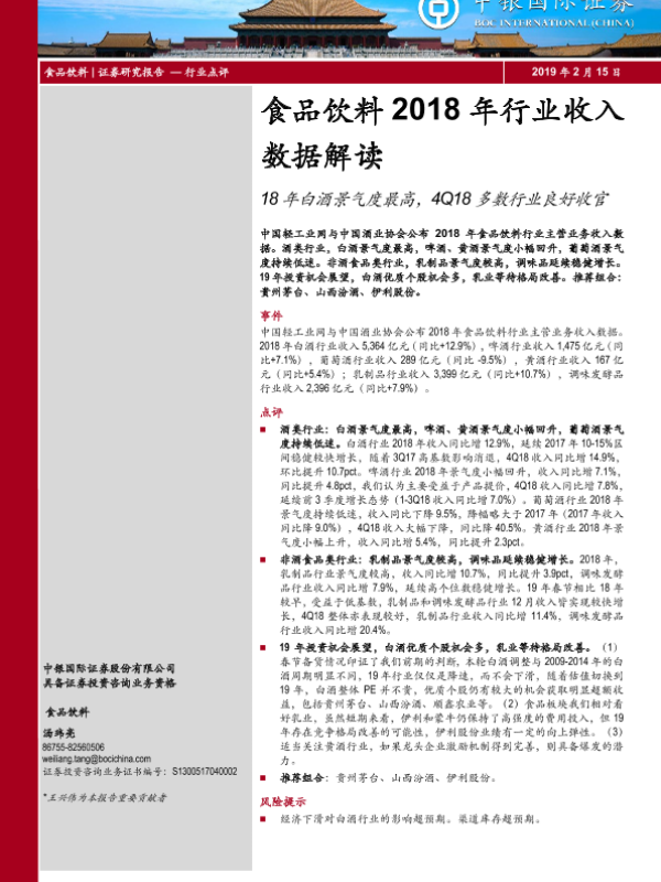 【中银证券】【20190215】食品饮料2018年行业收入数据解读:18年白酒景气度最高,4Q18多数行业良好收官-6页 行业研究