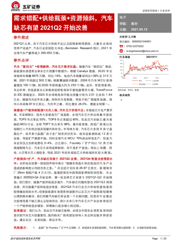【五矿证券】【20210512】电子行业:需求错配+供给瓶颈+资源倾斜,汽车缺芯有望2021Q2开始改善-20页 行业研究