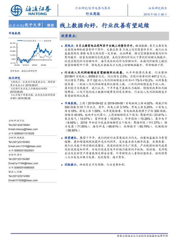 【海通证券】【20190908】20190908-海通证券-家用电器与器具行业周报:线上数据向好,行业改善有望延续-5页 行业研究