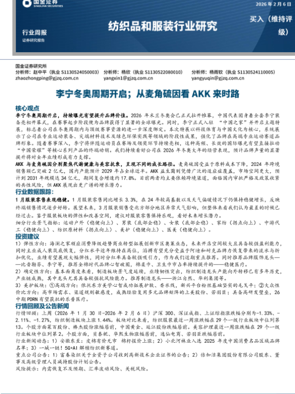 【国金证券】【202602】纺织品和服装行业研究周报:李宁冬奥周期开启;从麦角硫因看AKK来时路-12页 证券期货研究报告