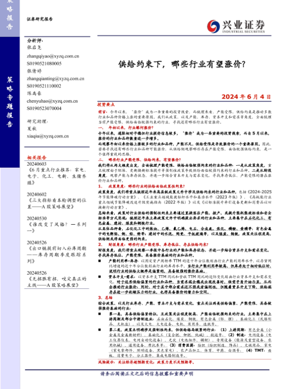 【兴业证券】【20240604】供给约束下,哪些行业有望涨价?-19页 行业研究