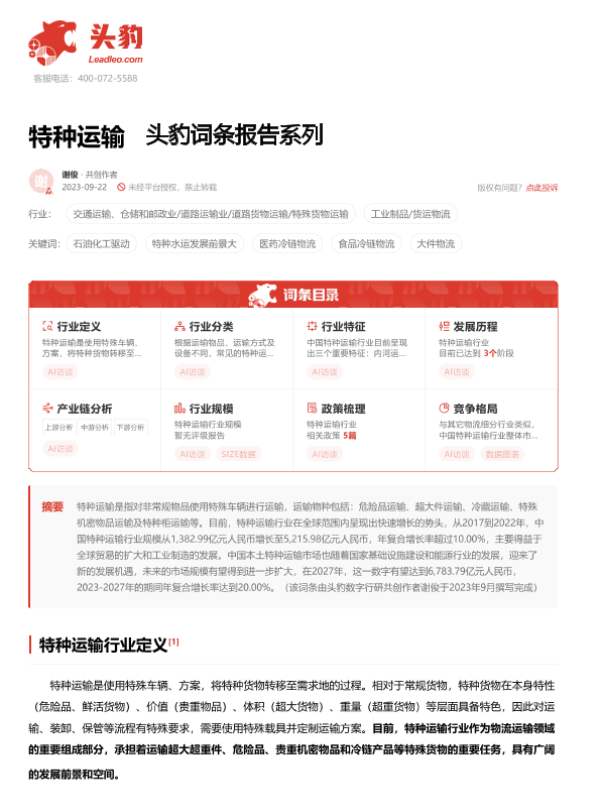 【头豹研究院】【20240111】特种运输 头豹词条报告系列-17页 行业研究