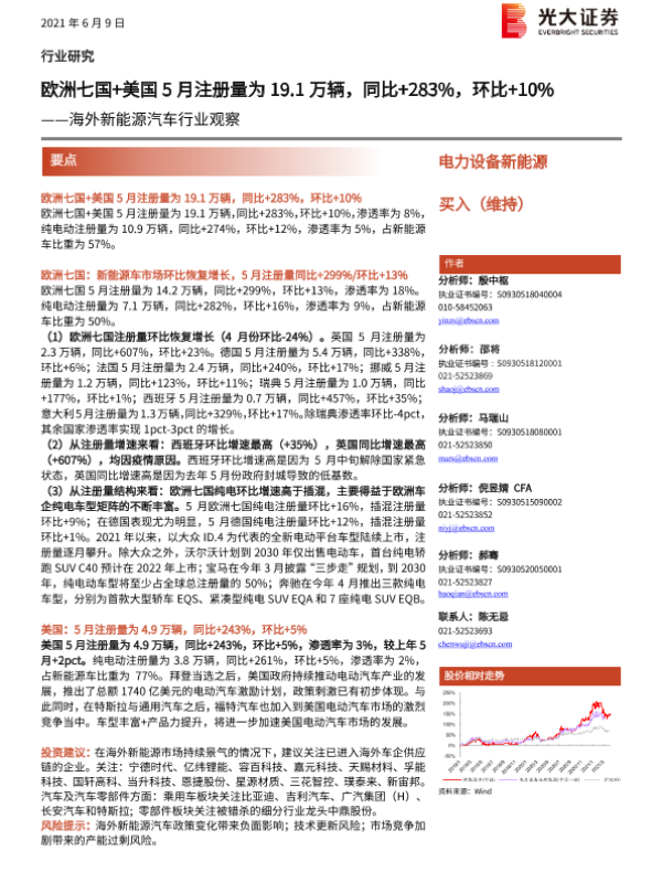 【光大证券】【20210609】海外新能源汽车行业观察:欧洲七国+美国5月注册量为19.1万辆,同比+283%,环比+10%-10页 行业研究
