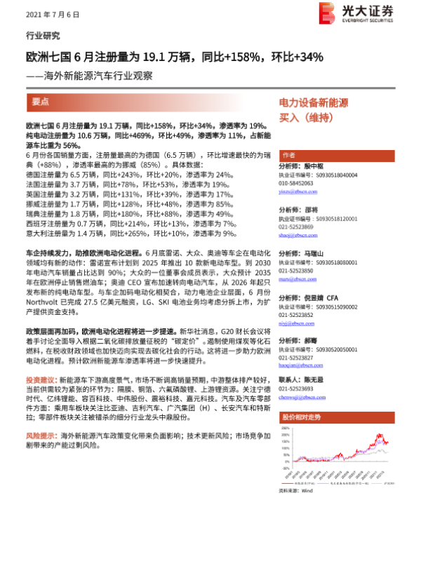 【光大证券】【20210706】海外新能源汽车行业观察:欧洲七国6月注册量为19.1万辆,同比+158%,环比+34%-7页 行业研究