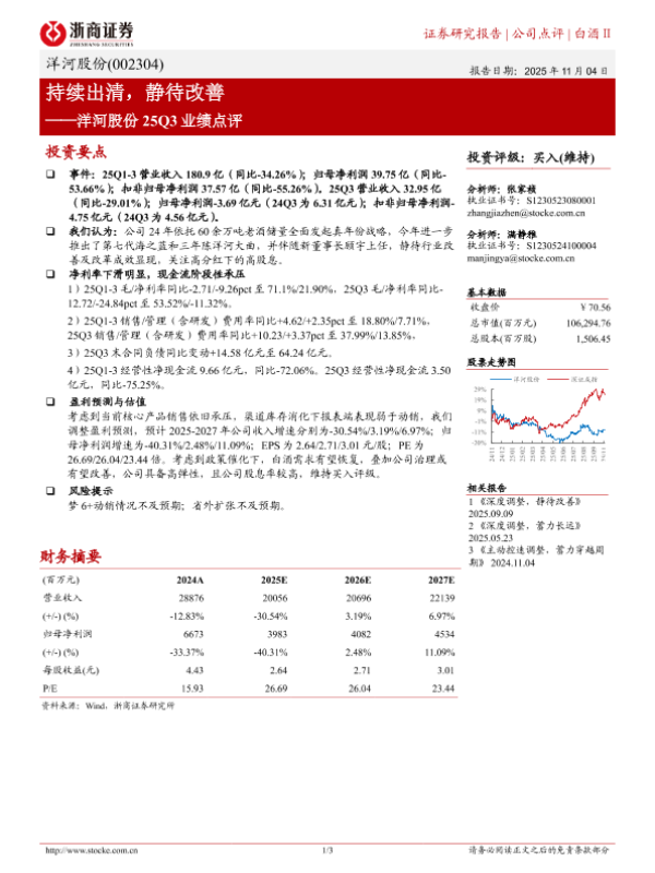 【浙商证券】【202511】持续出清,静待改善——洋河股份 25Q3业绩点评-3页 证券期货研究报告