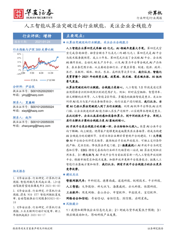 【华安证券】【20210124】计算机行业周报:人工智能从算法突破迈向行业赋能,关注企业全栈能力-14页 行业研究