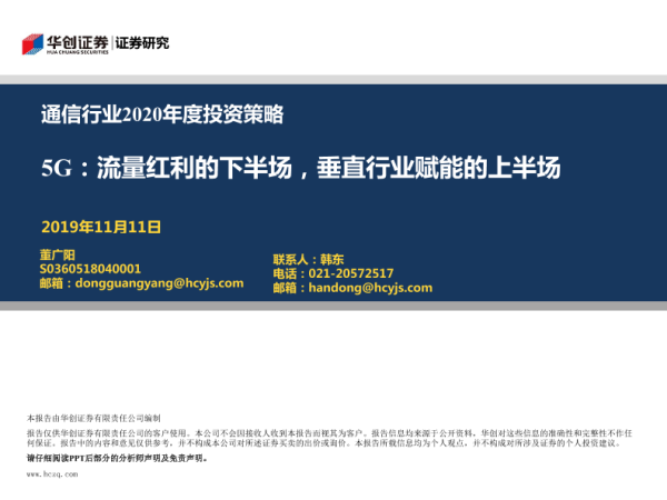 【华创证券】【20191111】通信行业2020年度投资策略:5G:流量红利的下半场,垂直行业赋能的上半场-34页 行业研究