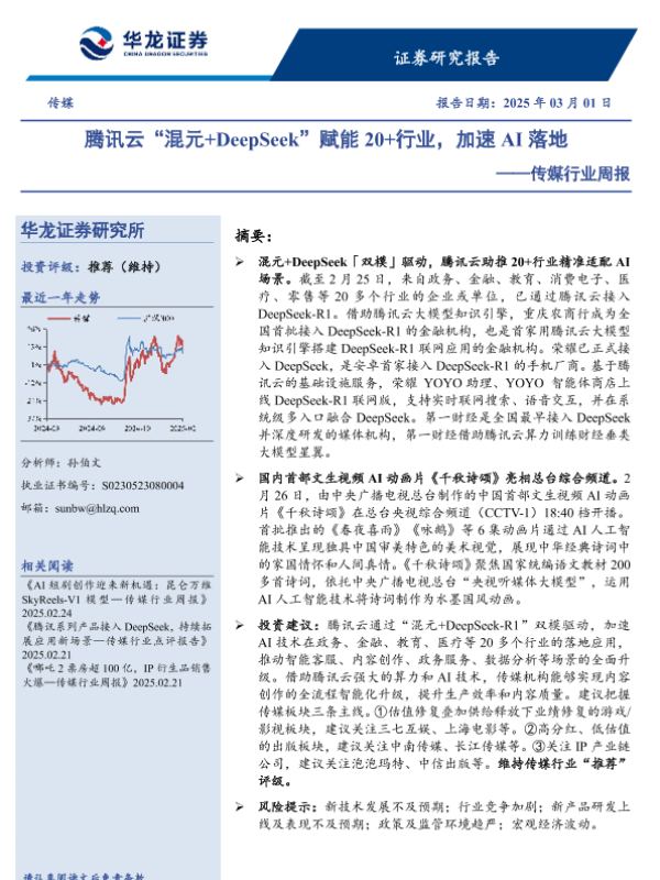 【华龙证券】【20250301】传媒行业周报:腾讯云“混元+DeepSeek”赋能20+行业,加速AI落地-11页 行业研究