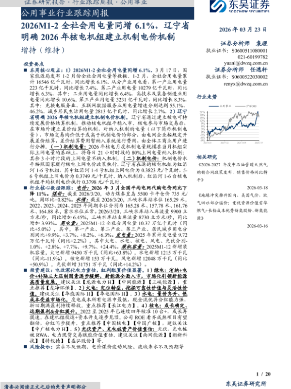 【东吴证券】【202603】2026M1-2全社会用电量同增6.1%,辽宁省明确2026年核电机组建立机制电价机制-20页 证券期货研究报告