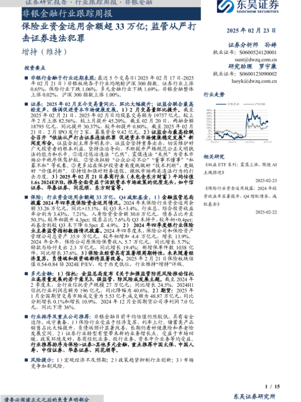 【东吴证券】【20250223】非银金融行业跟踪周报:保险业资金运用余额超33万亿;监管从严打击证券违法犯罪-15页 行业研究