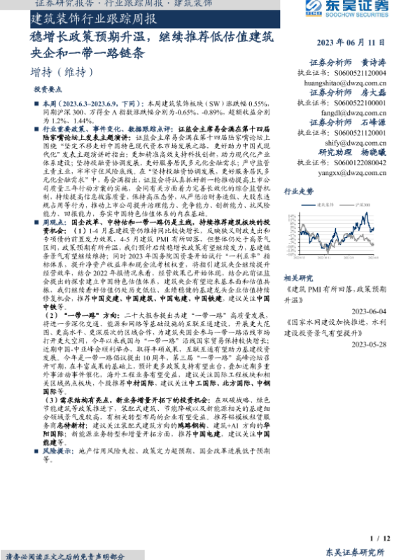 【东吴证券】【20230611】建筑装饰行业跟踪周报:稳增长政策预期升温,继续推荐低估值建筑央企和一带一路链条-12页 行业研究