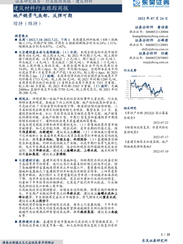 【东吴证券】【20220724】建筑材料行业跟踪周报:地产链景气底部,反弹可期-25页 行业研究