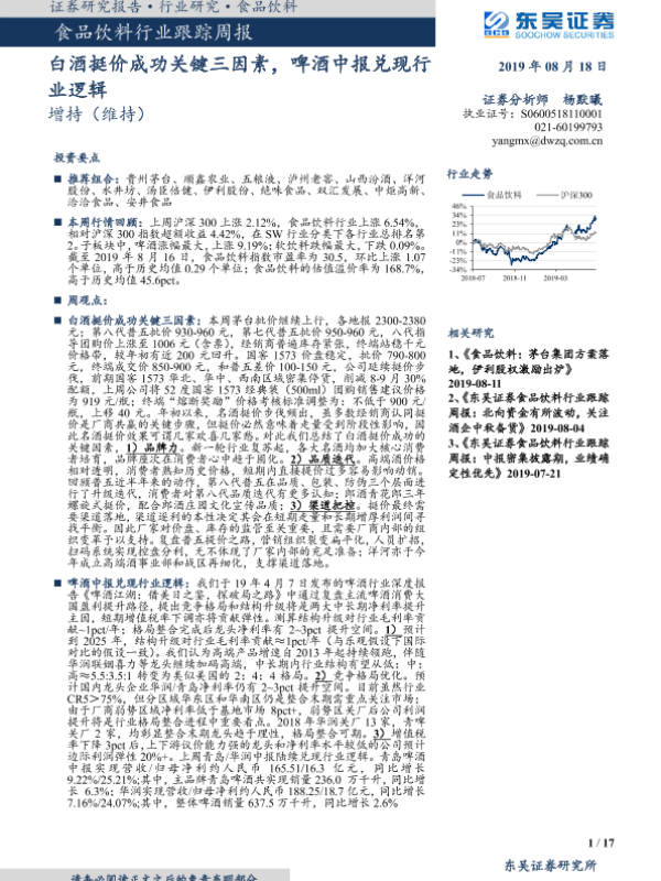 【东吴证券】【20190818】食品饮料行业跟踪周报:白酒挺价成功关键三因素,啤酒中报兑现行业逻辑-17页 行业研究