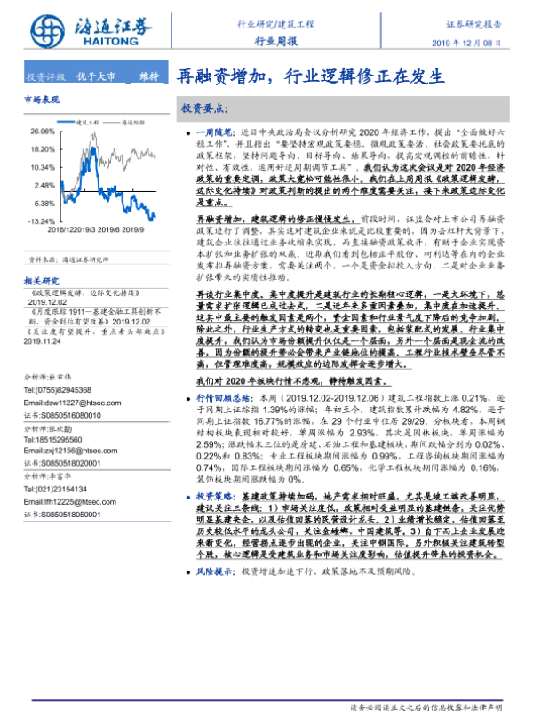 【海通证券】【20191208】建筑工程行业周报:再融资增加,行业逻辑修正在发生-6页 行业研究